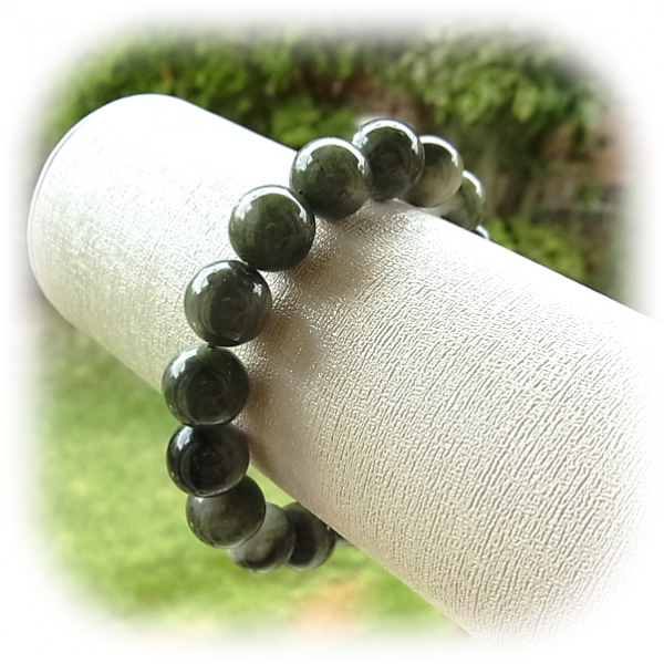 全体がリーベカイト入りの濃厚なブルーグレー色の丸玉ですが、更に針状のルチルと超稀少なエジリンがびっしりと混合されています。特に原石でも稀にしか産出されないエジリンが入った丸玉はほとんど見当たりません。